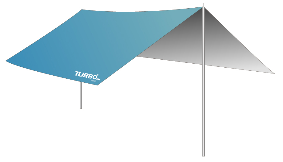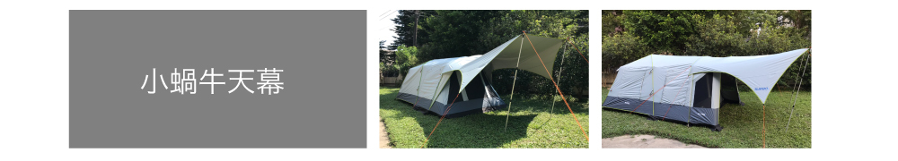 此種天幕搭法和屋頂型天幕搭法相似,但相較之下有較高的包覆性及防風效果,可置於風勢較大處,為帳篷擋風;也可在天幕內部在放置桌椅,就能優雅、舒適的觀賞山水美景,而且怎麼拍都好看。