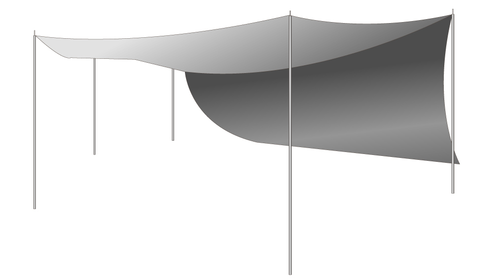 屋頂型天幕搭法,可起到很好的防曬、擋雨效果,但又能保持四周通風。因此,可適用於在天幕下放置桌椅進行野餐,或放置帳篷等,為露營的休息區域加強保護。