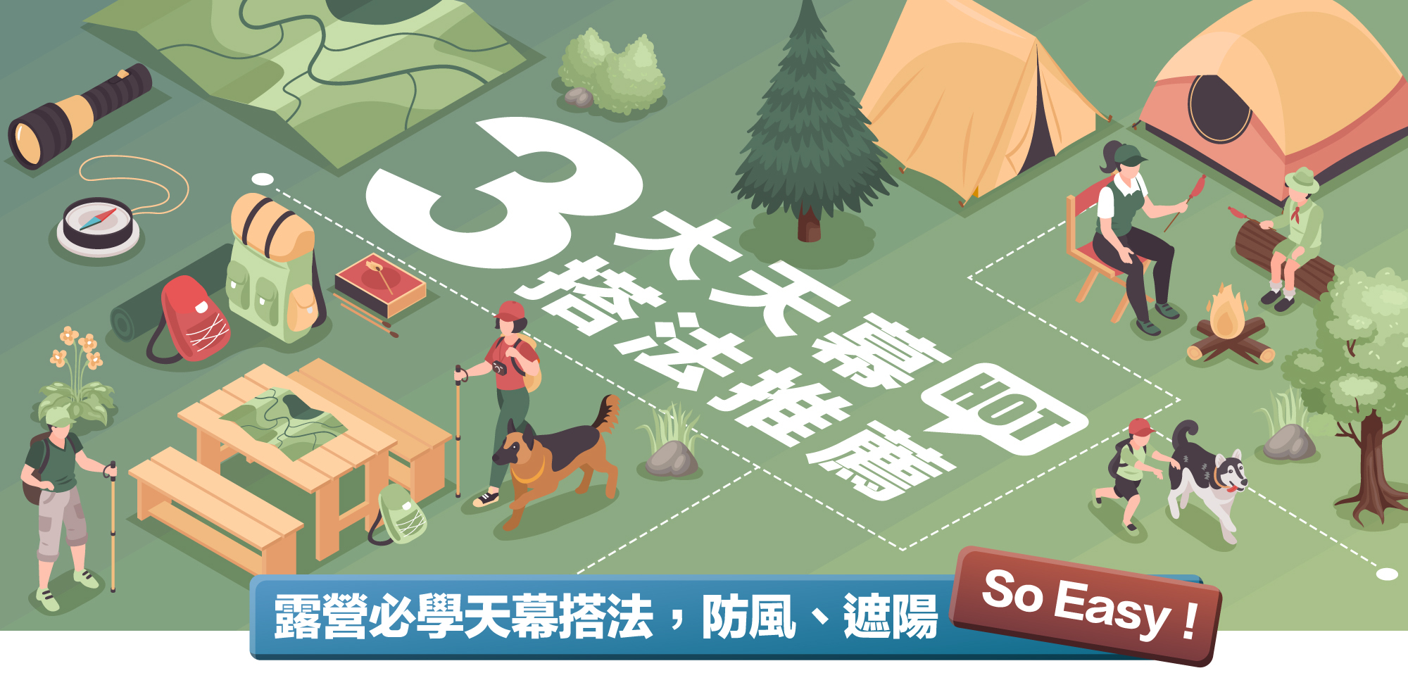 瞭解如何挑選合適的天幕後,接著,就一起來學習露營小白也能快速學會的3種天幕搭法。讓你不用再因烈日及狂風影響露營的好心情。