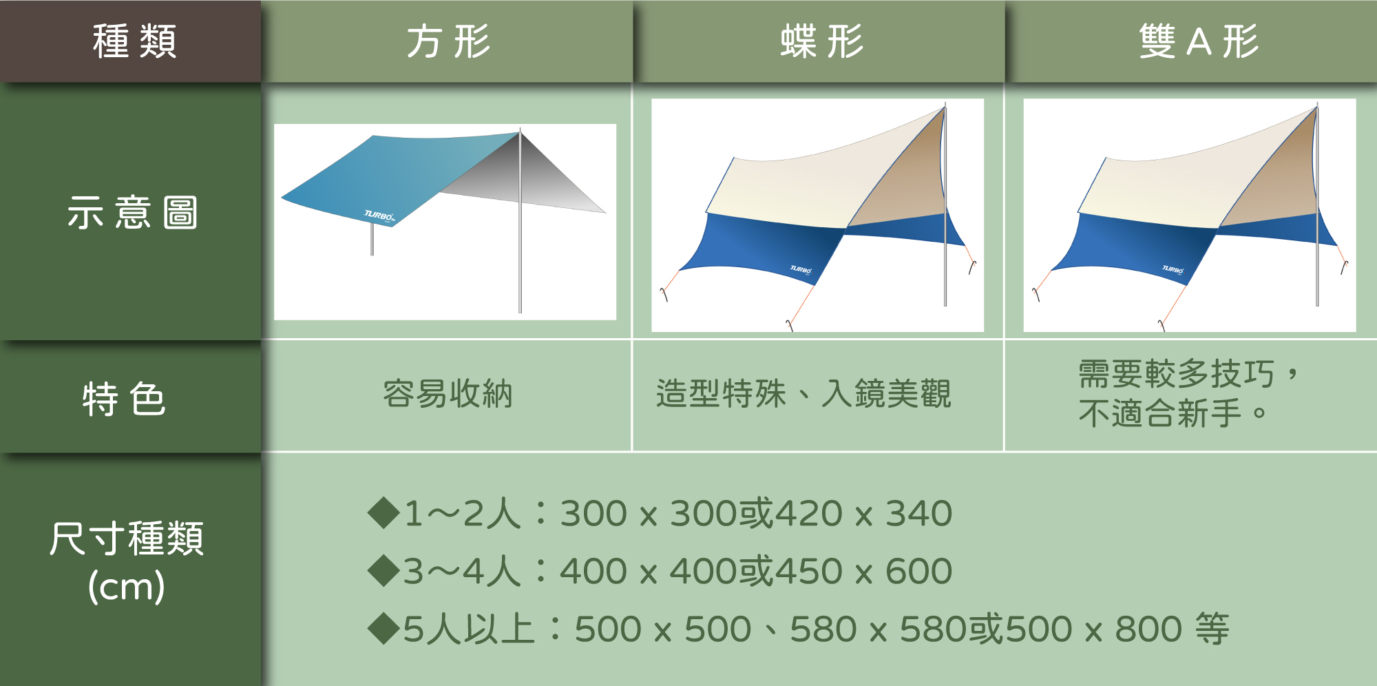 市售天幕的種類主要有方形、蝶形、以及雙A形等,且其尺寸規格多樣,導致許多露營新手不知該如何選購。其實每種天幕都有各自的特色,只要按照自己的需求,以及露營人數來選擇,就能把令你滿意的天幕帶回家。下表即列出各種天幕的特色、尺寸、與適用人數供你參考。