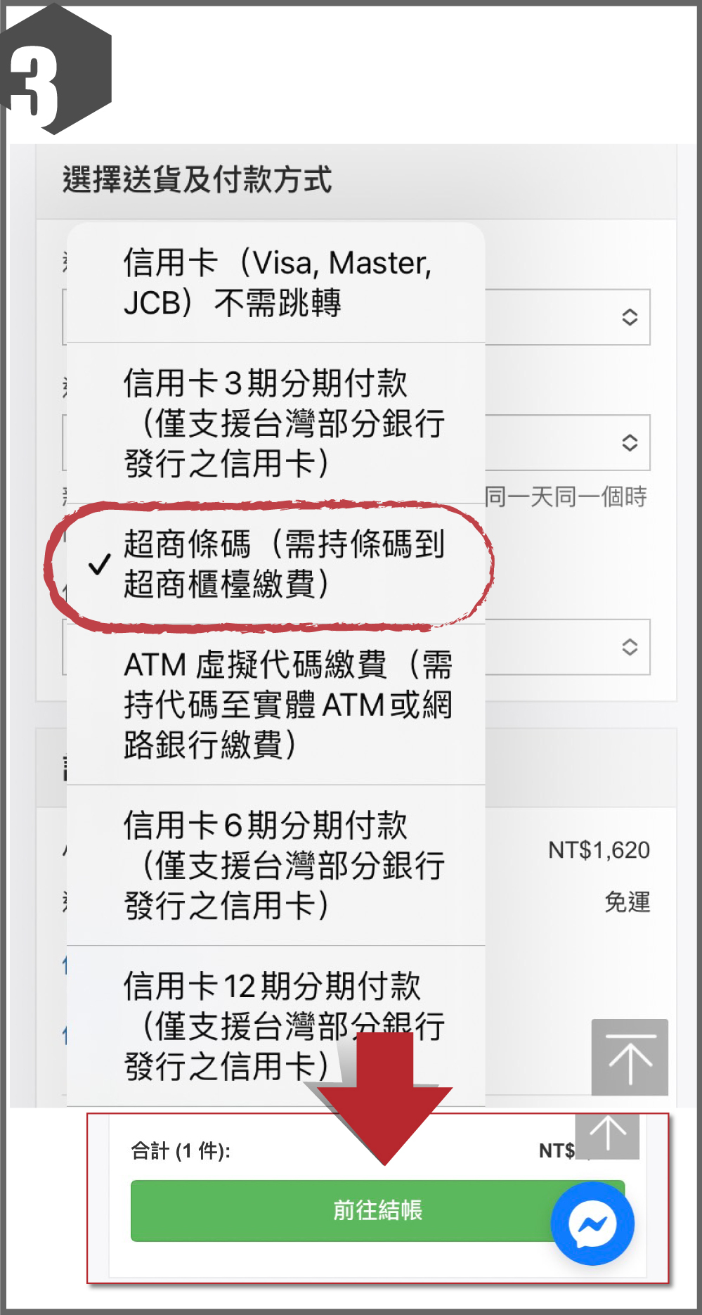 3.選擇超商條碼(需持條碼到超商櫃檯繳費),然後再按下前往結帳。