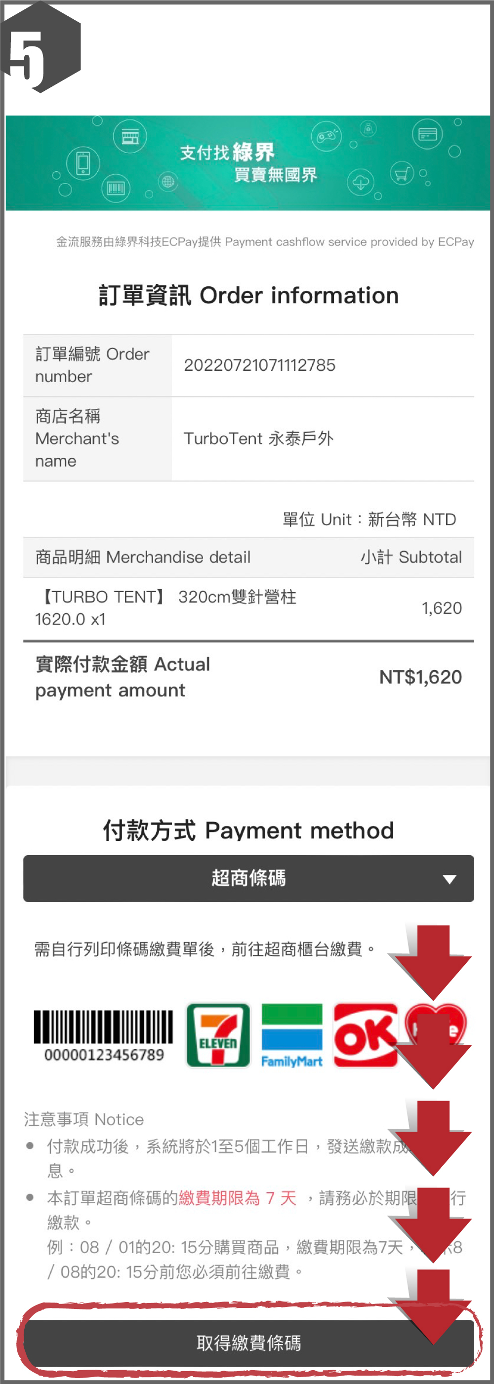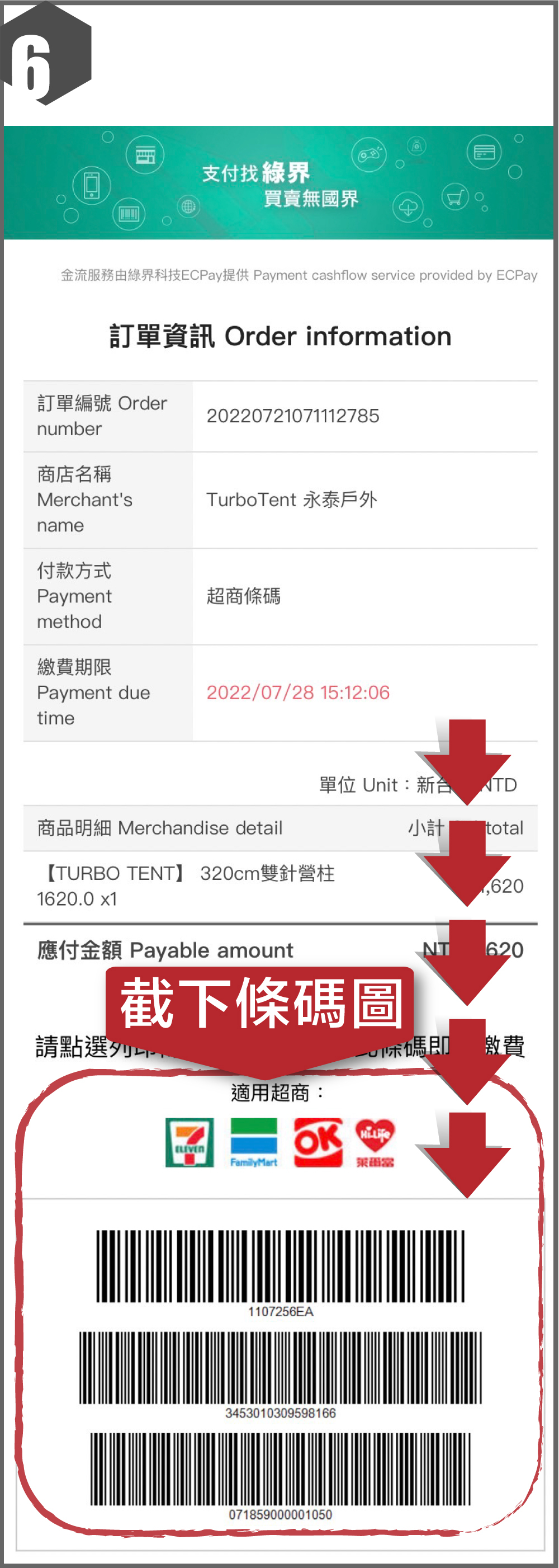 6.此時訂單資訊會顯示繳費期限,將畫面向下滑至最下方,可看見繳費條碼,用手機截圖取得條碼圖片後,於超商出示圖片即可完成繳費,