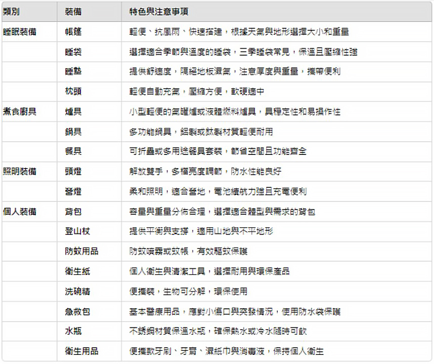 這些裝備能幫助你在野營時更輕鬆地應對各種挑戰,提升整體戶外體驗,以下統整一張裝備清單,可以直接列印下來進行整理自己的露營裝備,露營者可根據你的行程需求進行選擇和準備,確保每次野營都能安全愉快地度過。