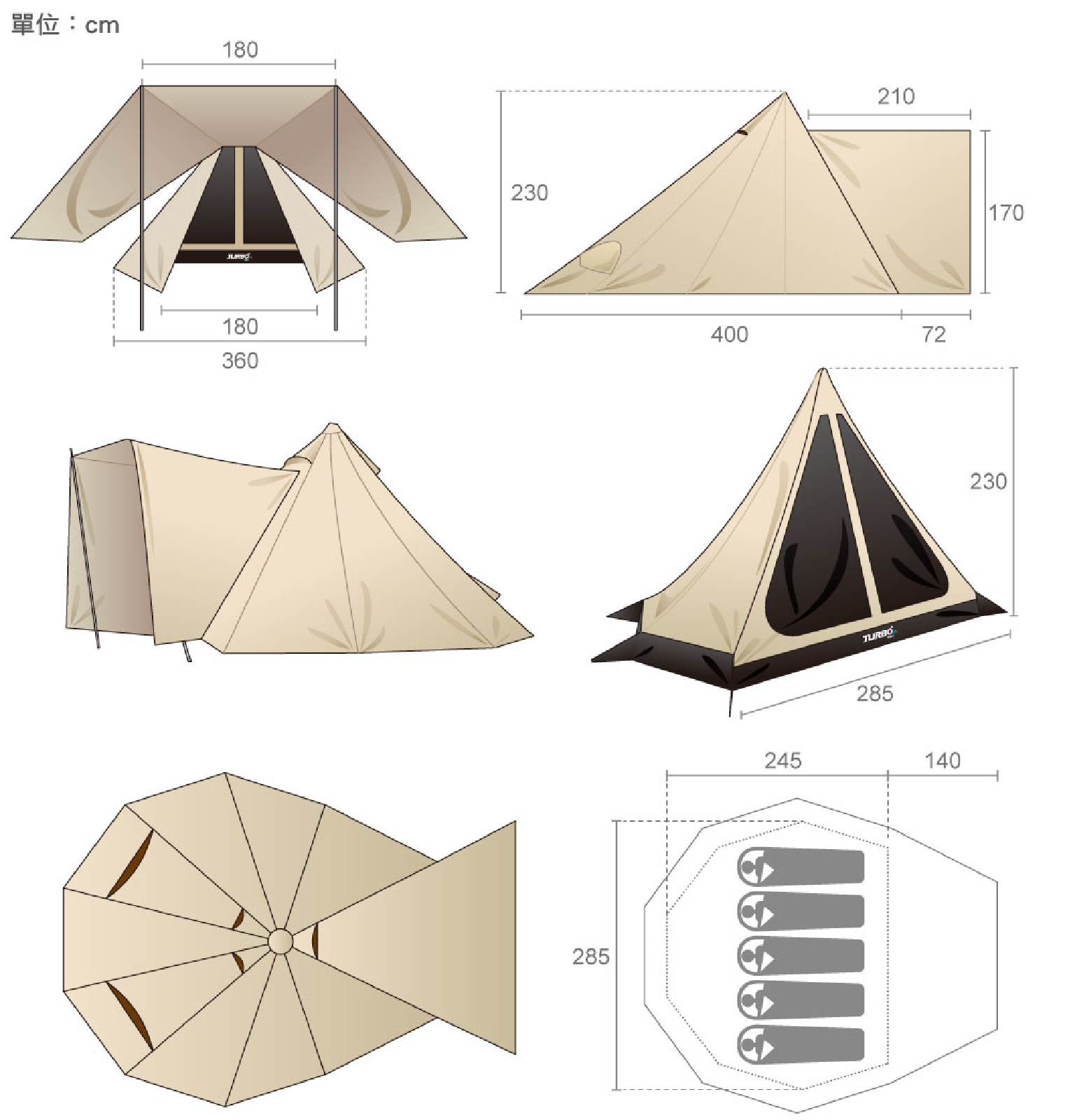 Tepee 400 印地安五人帳 偏心軸的設計,使得一竿帳的內部使用空間更便利,帳篷內讓出的空間可更好的放置睡墊,底部獨特的增高設計,更加有效利用內部空間,不製造死角,高度更是高達2m以上,內部站立絕對沒問題,開闊的前庭設計,印地安帳也可以擁有小客廳,現在TURBO TENT也有 露營帳篷裝備出租服務 ,讓還在猶豫的營友們,可以先體驗不同帳篷的特色,租借服務更有套餐可做選擇,實現懶人露營,裝備都幫您準備好了!