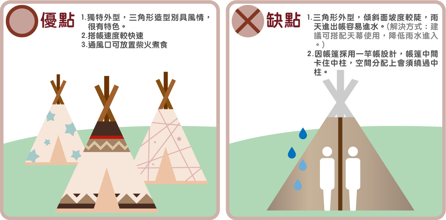 A2:印地安帳的三角形特色,導致出入口呈現斜面,開門較不方便,下雨天時,比起普遍看到的家庭帳篷款式,更容易會有進水問題,Tepee 400 印地安五人帳篷為了解決這項天缺,在設計上,不讓大門出現斜面,而是改成屋簷式的屋頂設計,自帶的前庭,讓雨水減少滲水或漏水問題。
