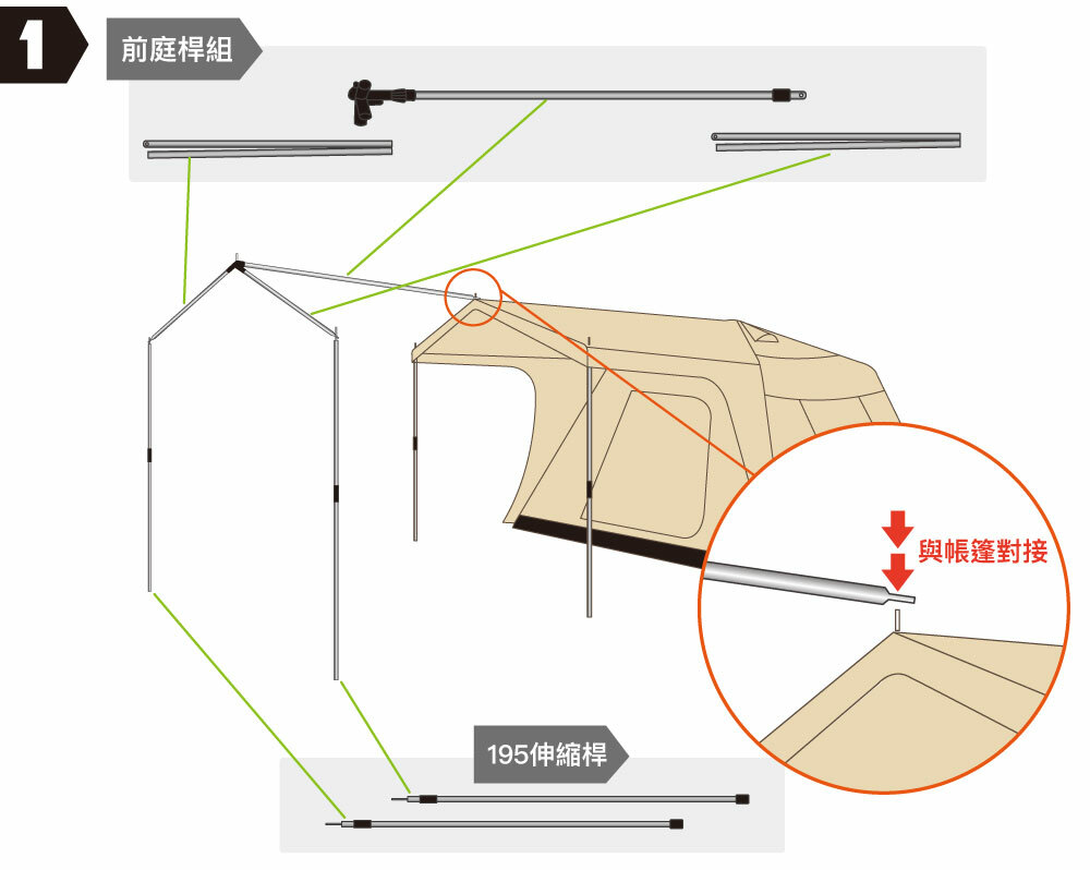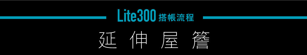 將剩下的2根195伸縮桿安裝好。再將主帳與延伸屋簷接合處的拉耳穿梭交叉,最後將營繩拉好,即可完成延伸屋簷的搭設。