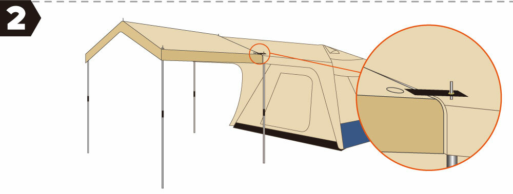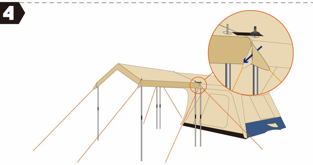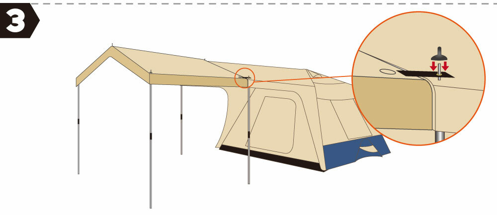 將延伸屋簷套上前庭桿。將固定織帶扣上主帳的伸縮桿固定住。