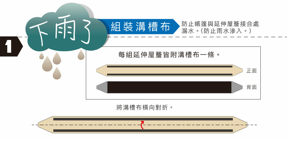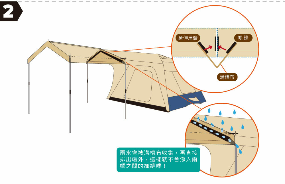 將溝槽布表面的魔鬼氈,分別氈黏上帳篷與延伸屋簷。使這兩個篷布之間的接合處緊密接合,將雨水引導至篷外。