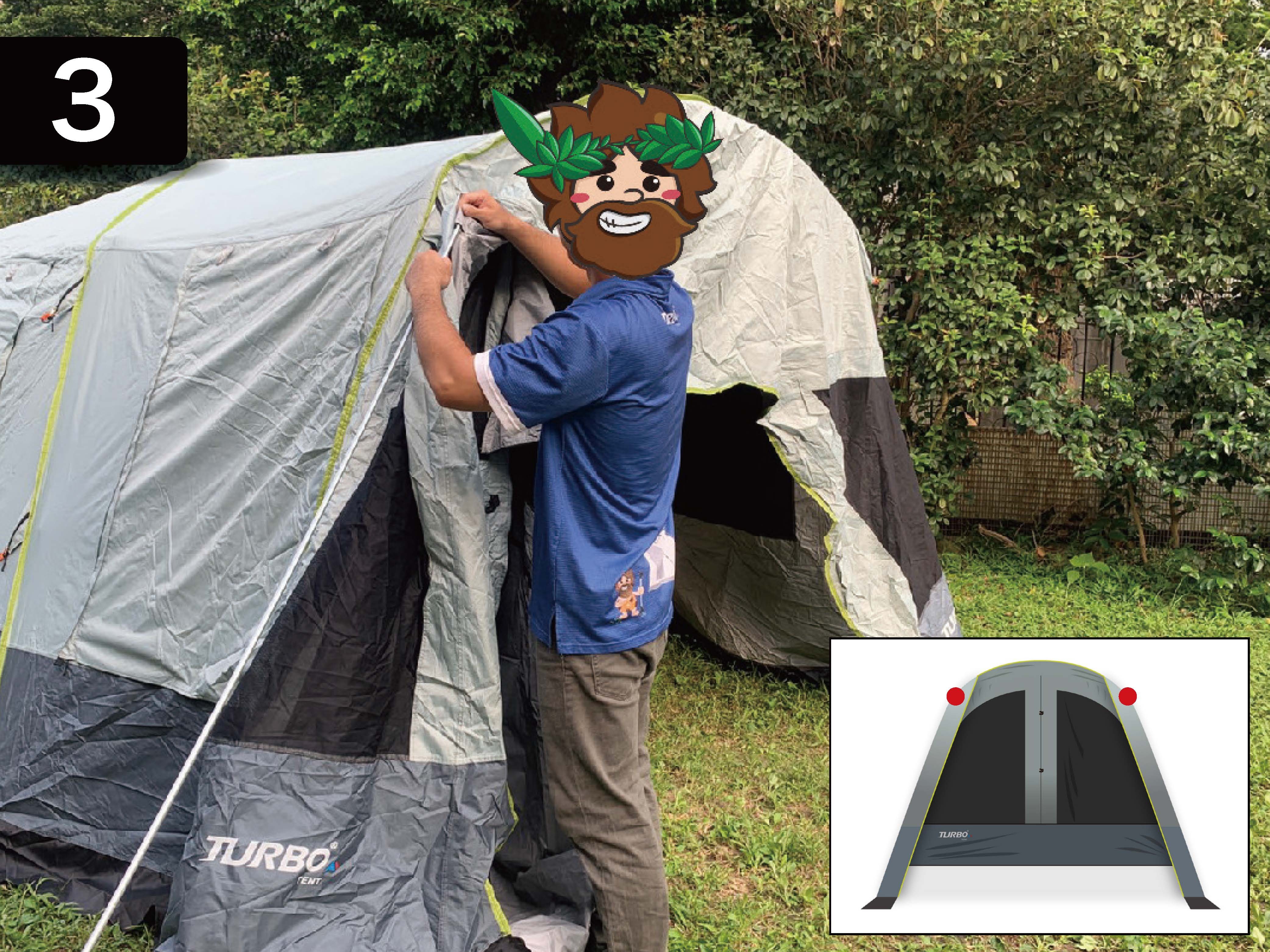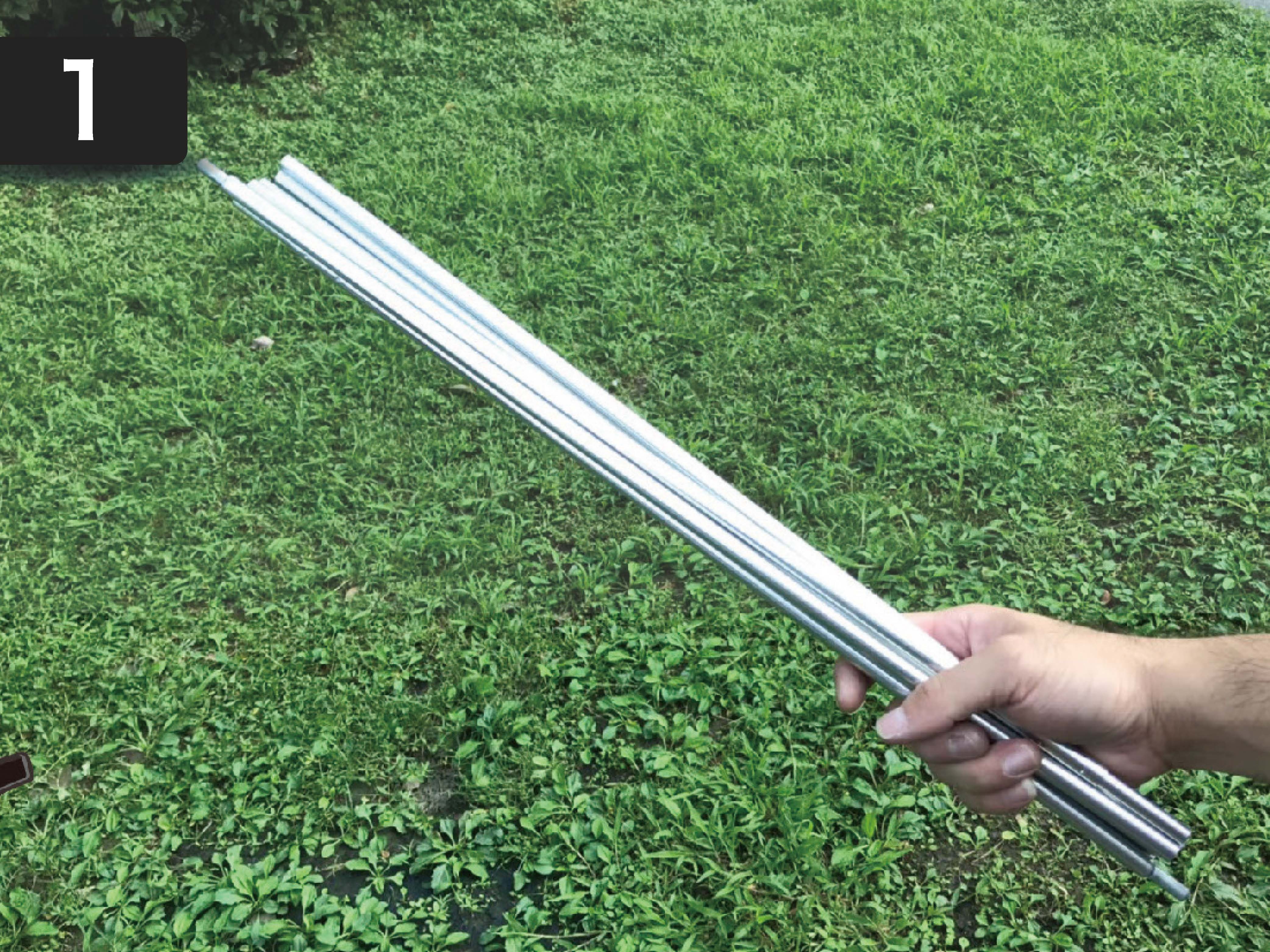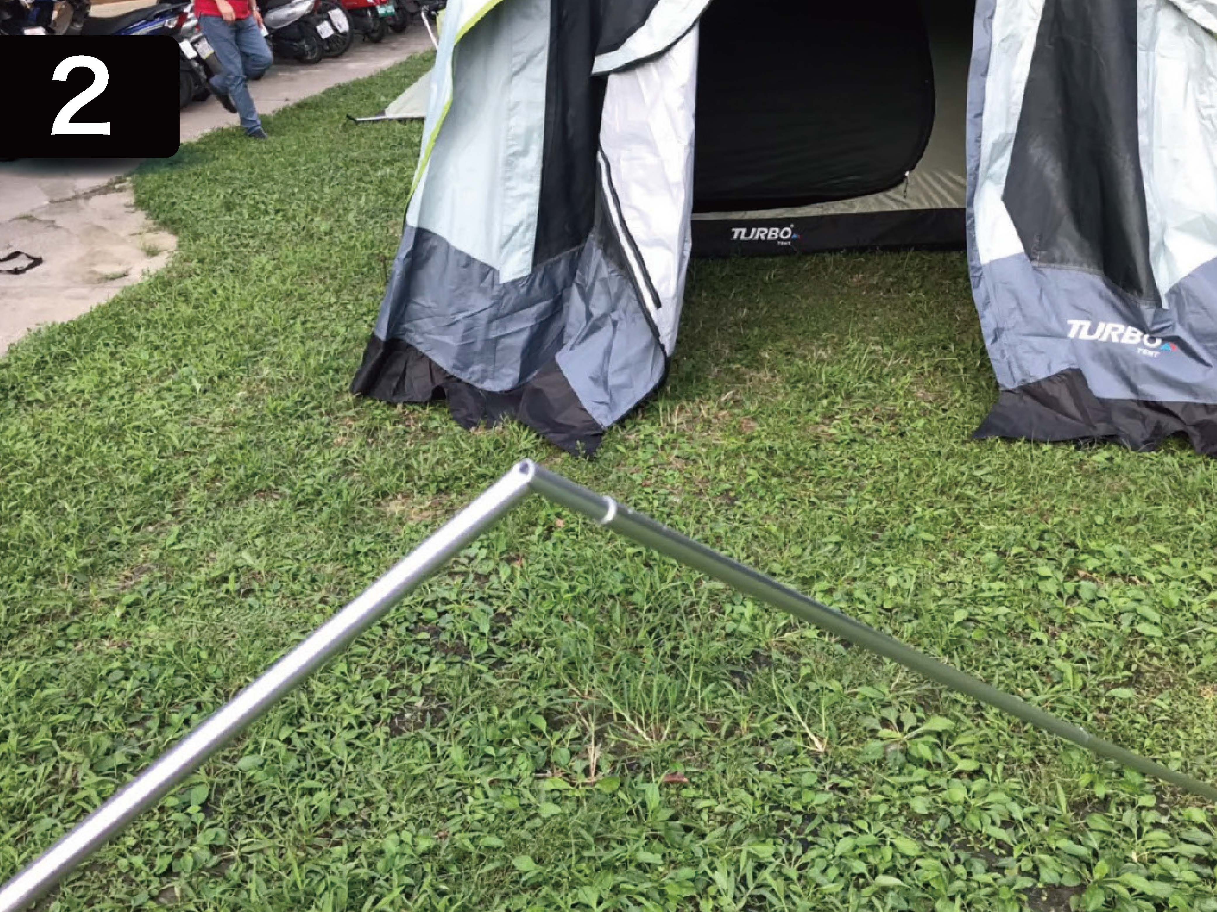 將屋簷桿穿進外帳前端的穿洞孔。前端兩側皆有洞孔,將屋簷桿穿過去。
