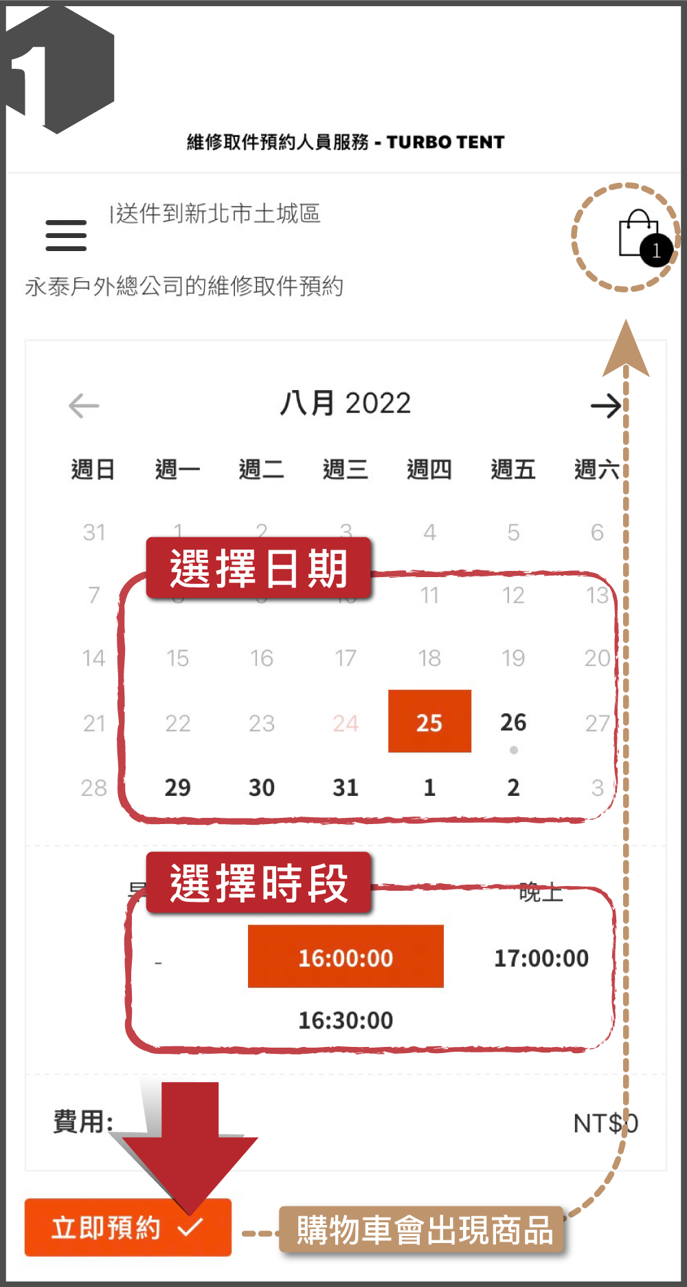 1.預約好日期及時段之後,按下方立即預約,此時右上的購物車會出現選項。