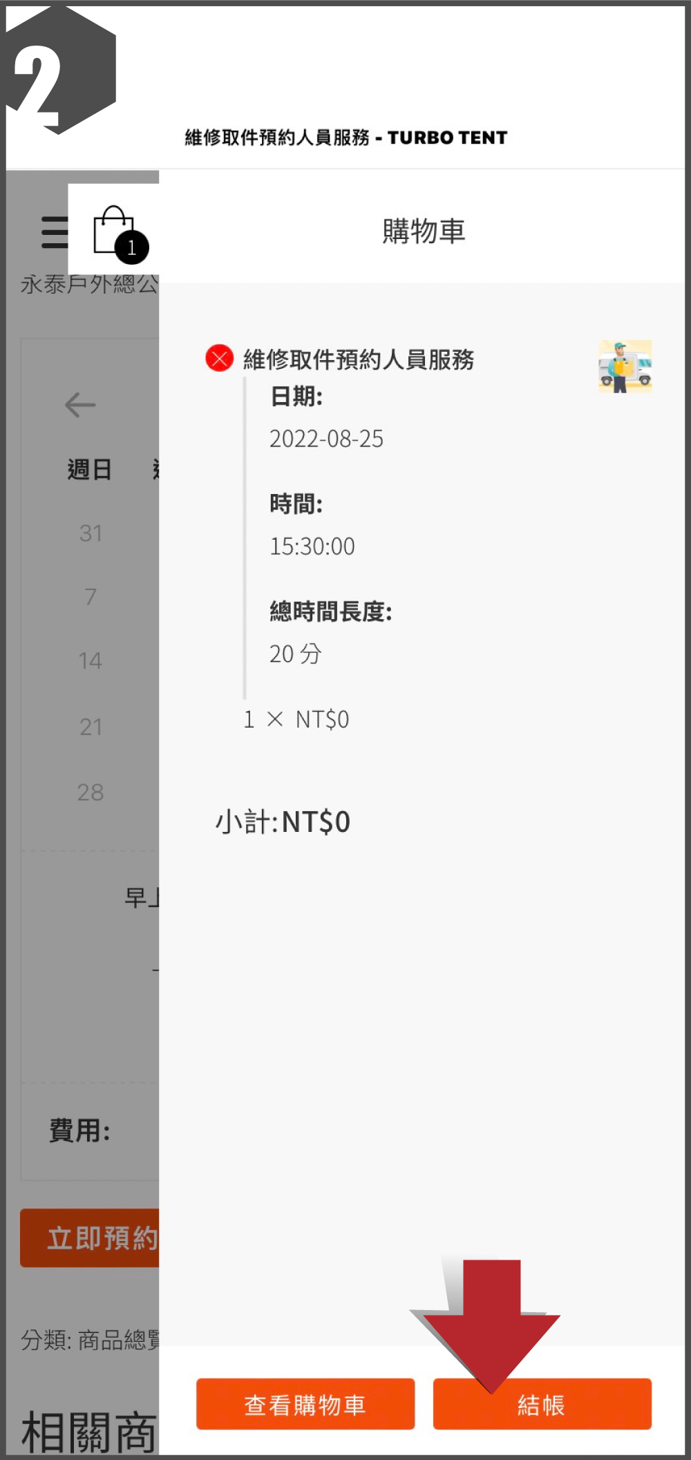 2.點開購物車,會滑出您的預約資訊,確認好之後,請按結帳。(這個動作不會產生任何費用)