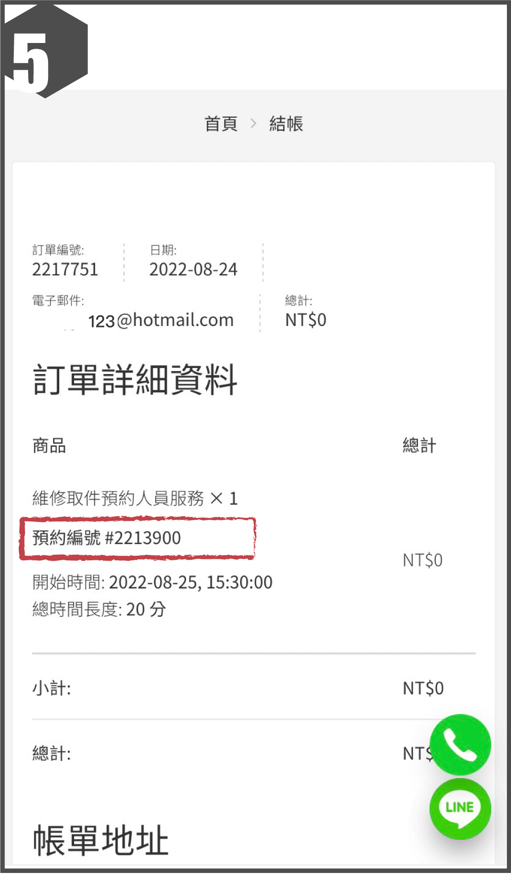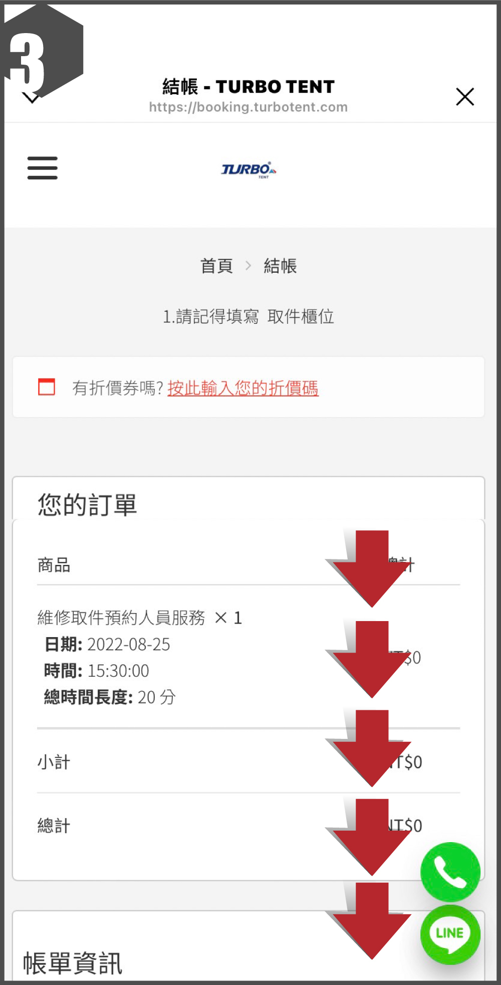 3.結帳頁面會出現你的預約資訊,將畫面向下滑。